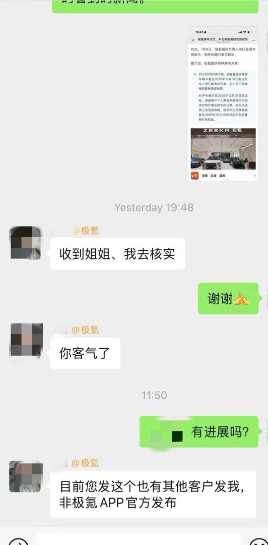 按照这一标准,王女士的情况应符合购置税兜底条件。但与王女士一同维权、情况类似的一位车主找到门店工作人员,得到的回复却是,这一解决方案并非由极氪官方APP发布,所以目前不能承认这一说法。截至1月12日,王女士及其他类似情况的10余位车主问题尚未得到解决。记者尝试联系极氪,但截至发稿,该公司并未对上述解决方案为何门店不予承认作出回应。